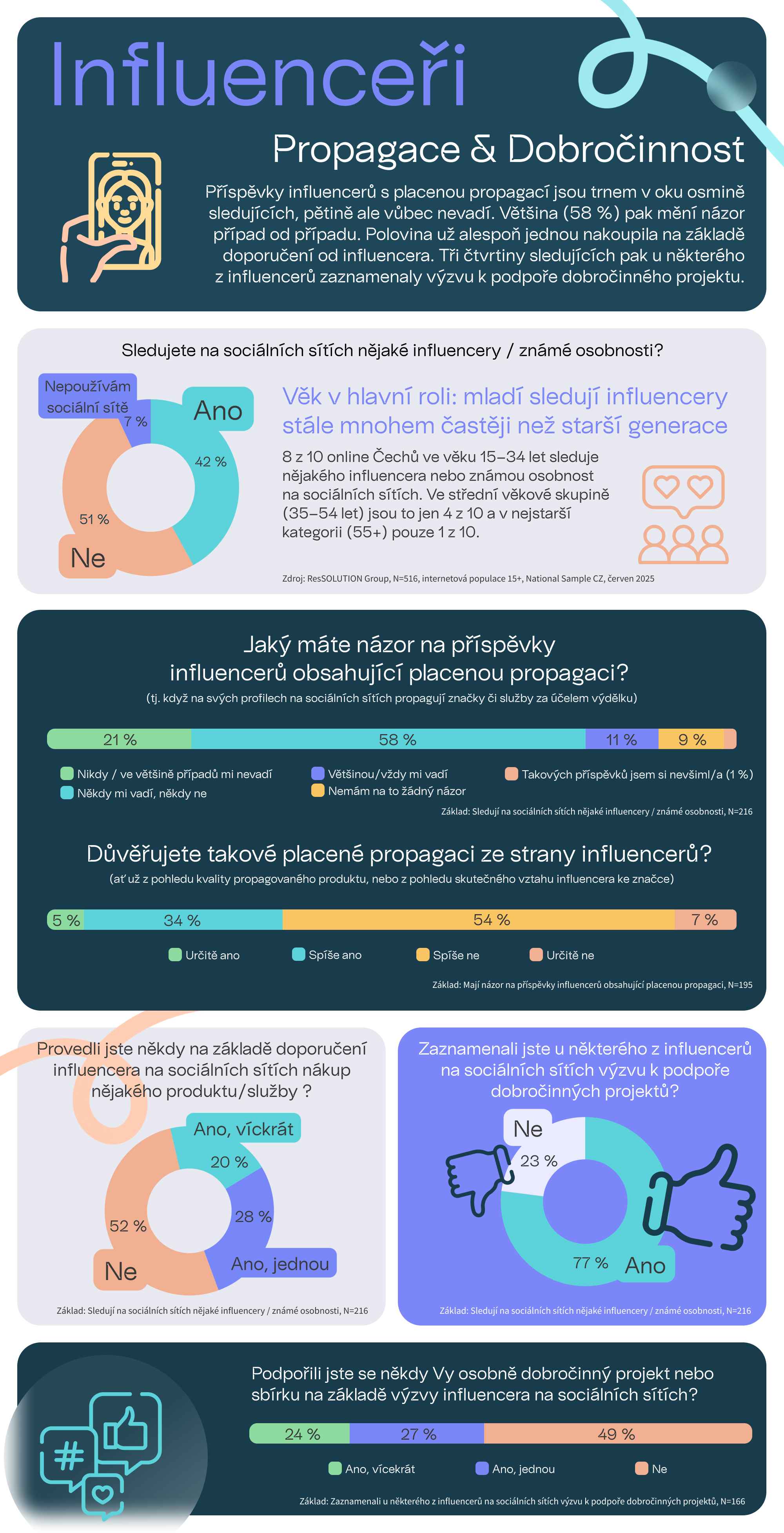 Příspěvky influencerů s placenou propagací jsou trnem v oku osmině sledujících, pětině ale vůbec nevadí. Většina (58 %) pak mění názor případ od případu. Polovina už alespoň jednou nakoupila na základě doporučení od influencera. Tři čtvrtiny sledujících pak u některého z influencerů zaznamenaly výzvu k podpoře dobročinného projektu.