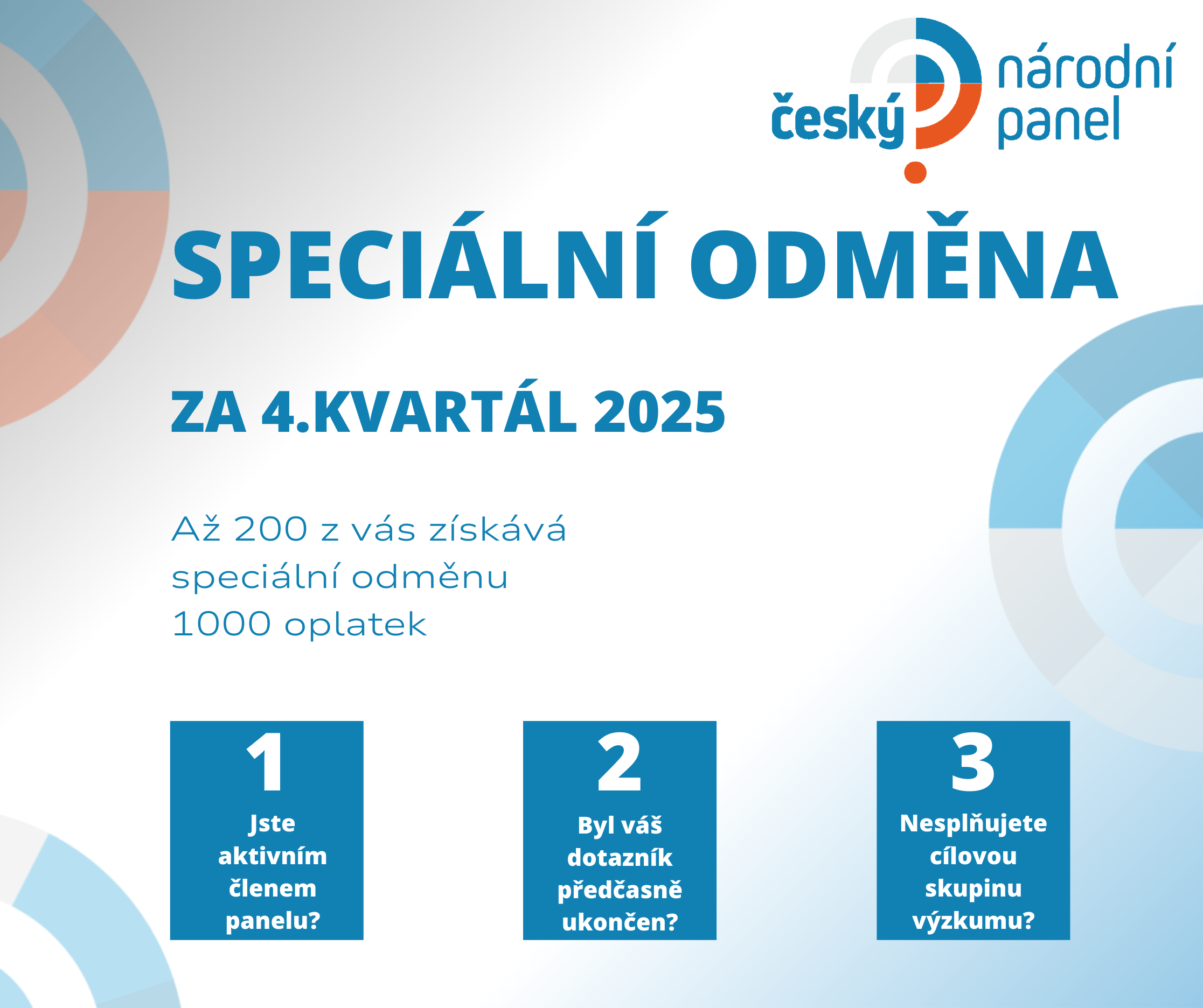 Pokud jste se během října, listopadu a prosince 2025 alespoň ve dvadseti případech s předčasným ukončením výzkumu z důvodu naplnění kvóty nebo proto, že jste nesplňovali podmínky konkrétního výzkumu, byli jste zařazeni do seznamu účastníků s možností získat bonusovou odměnu. Z tohoto seznamu jsme následně náhodně vybrali až 200 z vás, kteří získali speciální odměnu ve výši 1000 oplatek. Podmínky pro zařazení do slosování splnilo ve čtvrtém čtvrtletí 2025 celkem 3 947 respondentů Českého národního panelu. Seznam odměněných najdete na tomto ODKAZU.