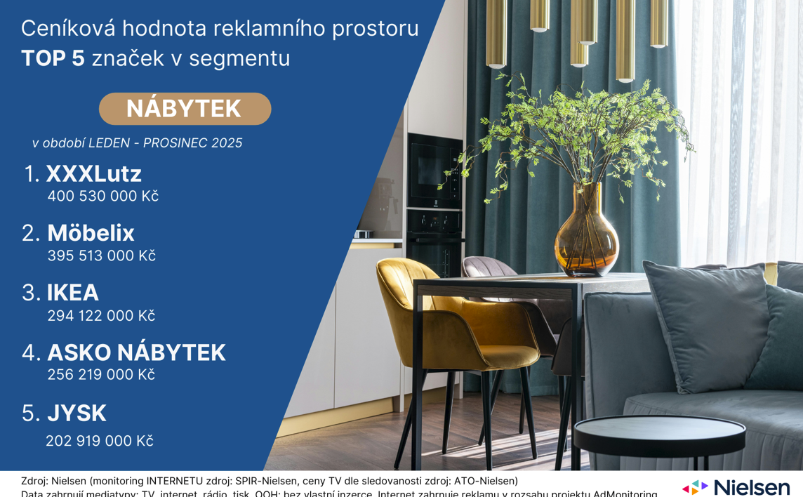 Doplnění poskytují data z monitoringu reklamy Ad Intel společnosti Nielsen, ve kterém jsme se podívali na kategorii nábytku za rok 2025. Nejsilnější inzerci měla podle něj značka XXXLutz.