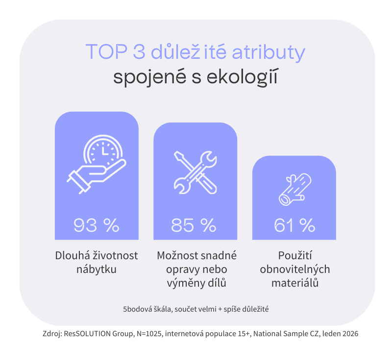Při výběru nábytku Češi kladou největší důraz na kvalitu a praktičnost. Dlouhou životnost považuje za důležitou 93 % dotázaných, přičemž více než dvě pětiny ji považují za zcela klíčovou. Podobně významná je také možnost snadné opravy nebo výměny dílů, která je důležitá pro 85 % lidí.