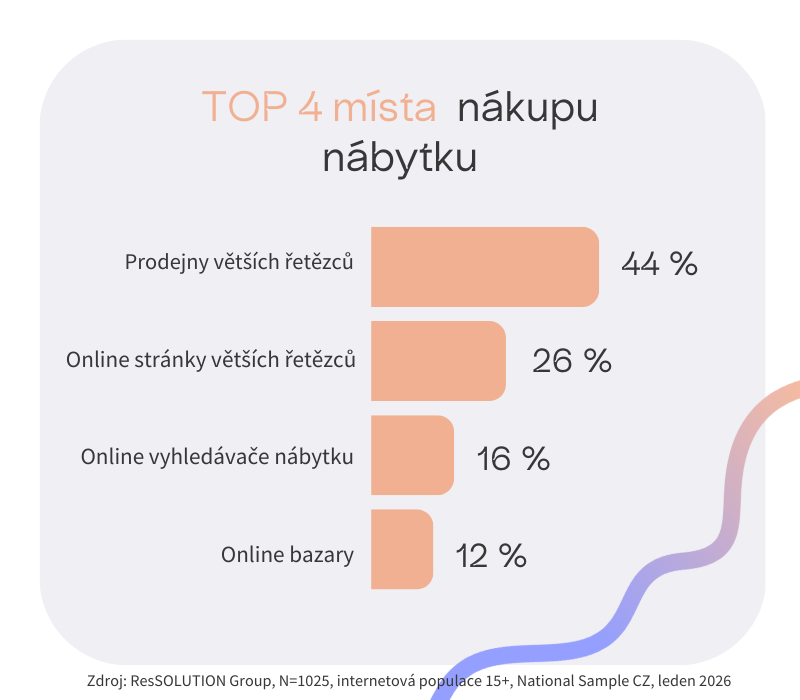 Při volbě preferovaného místa nákupu většina lidí stále upřednostňuje fyzickou návštěvu prodejny. Čtyři z deseti by si nábytek ideálně pořídili v kamenných obchodech velkých řetězců. Online stránky těchto řetězců upřednostňuje 13 % populace. Zhruba 9 % lidí preferuje zakázkovou výrobu od truhláře a podobně velká část nejraději využívá online vyhledávače nábytku.