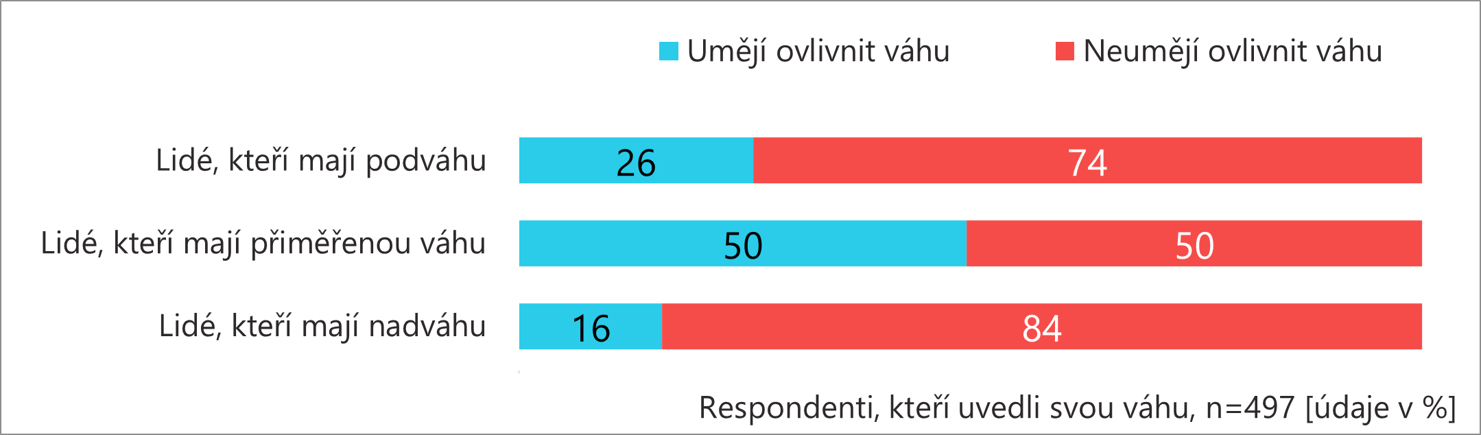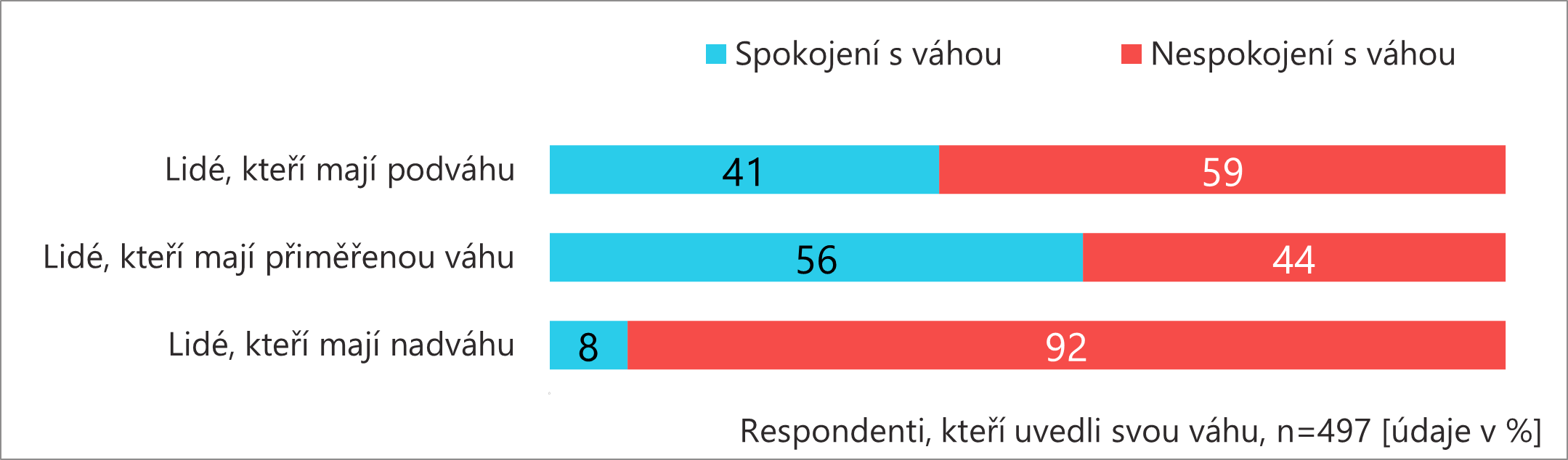 Obecně platí, že lidé, kteří svou váhu dokážou ovlivnit, s ní jsou spokojenější. Kdo by ale čekal, že aspoň jedna skupina bude výrazně spokojená a bude pro ni snadné svou váhu snížit, držet nebo zvýšit, bude zklamaný. Lidé s přiměřenou váhou jsou častěji spokojení se svou váhou (56 %) a častěji ji dokážou ovlivnit (50 %), ale podíl nespokojených nebo těch, co váhu ovlivnit neumějí, je i v této skupině nemalý. U zbylých dvou skupin platí pravidlo, že každý chce to, co nemá. Více než polovina lidí s podváhou spokojená není (59 %) a většině z nich se váhu nedaří zvýšit (74 %). Naprostá většina lidí s nadváhou spokojená se svou váhou není (92 %) a nedokáže ji snížit (84 %).