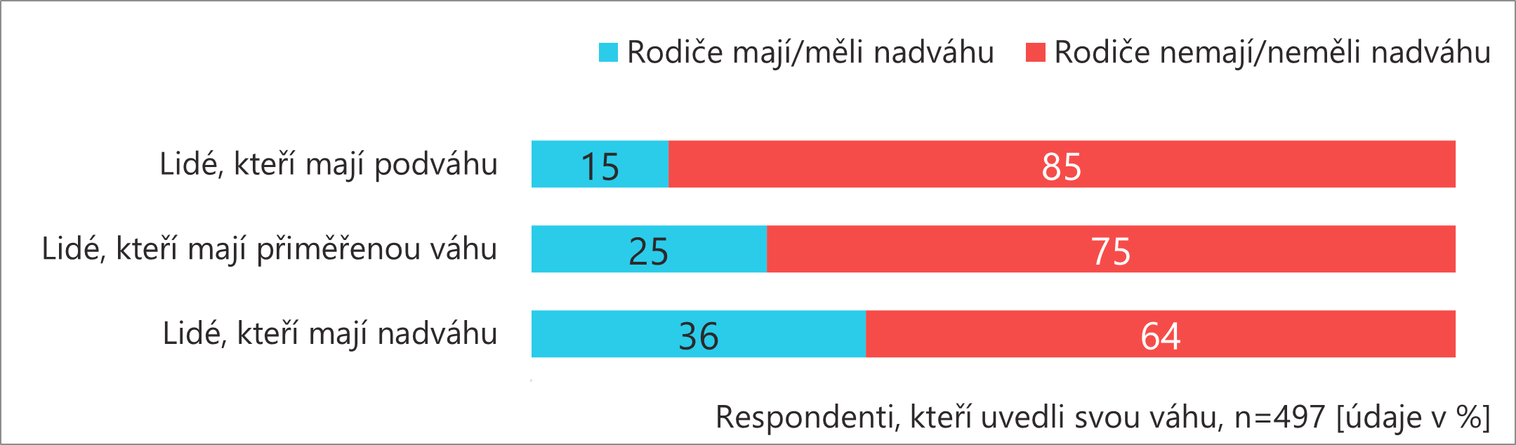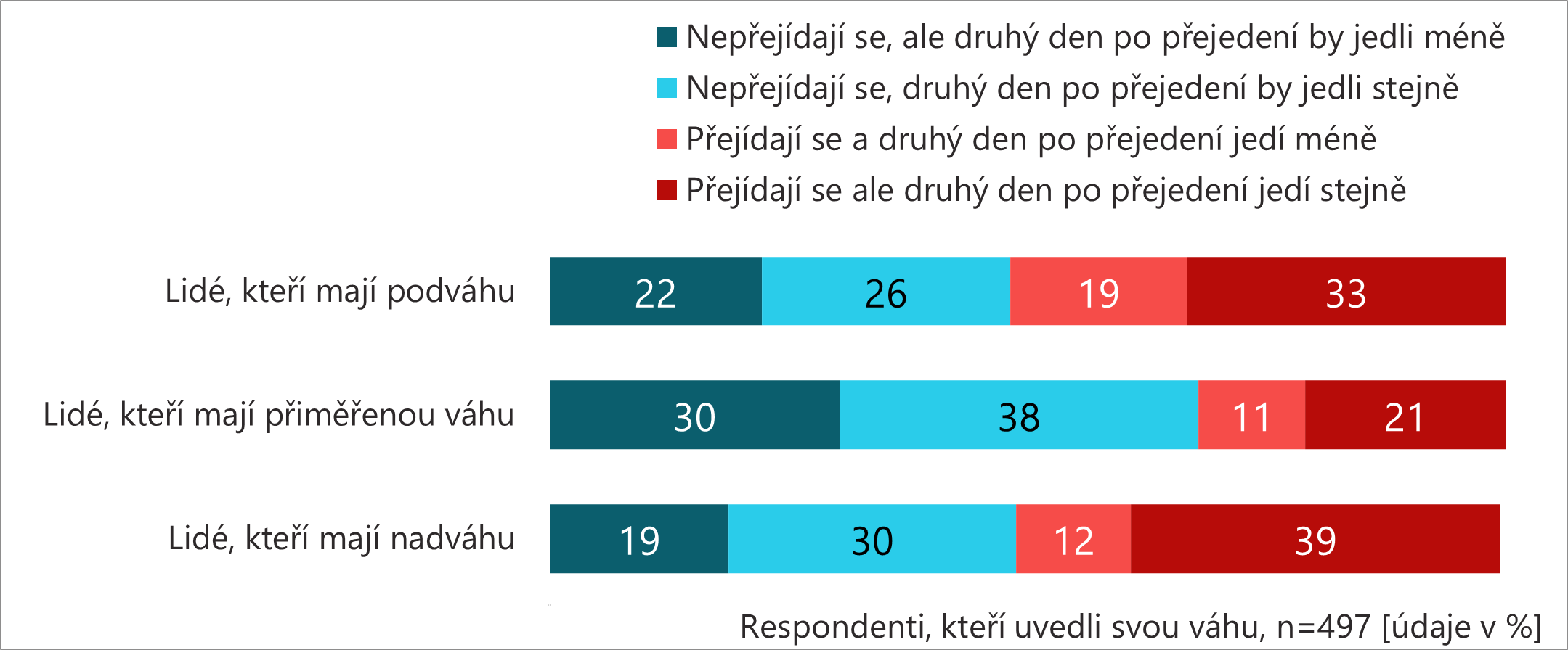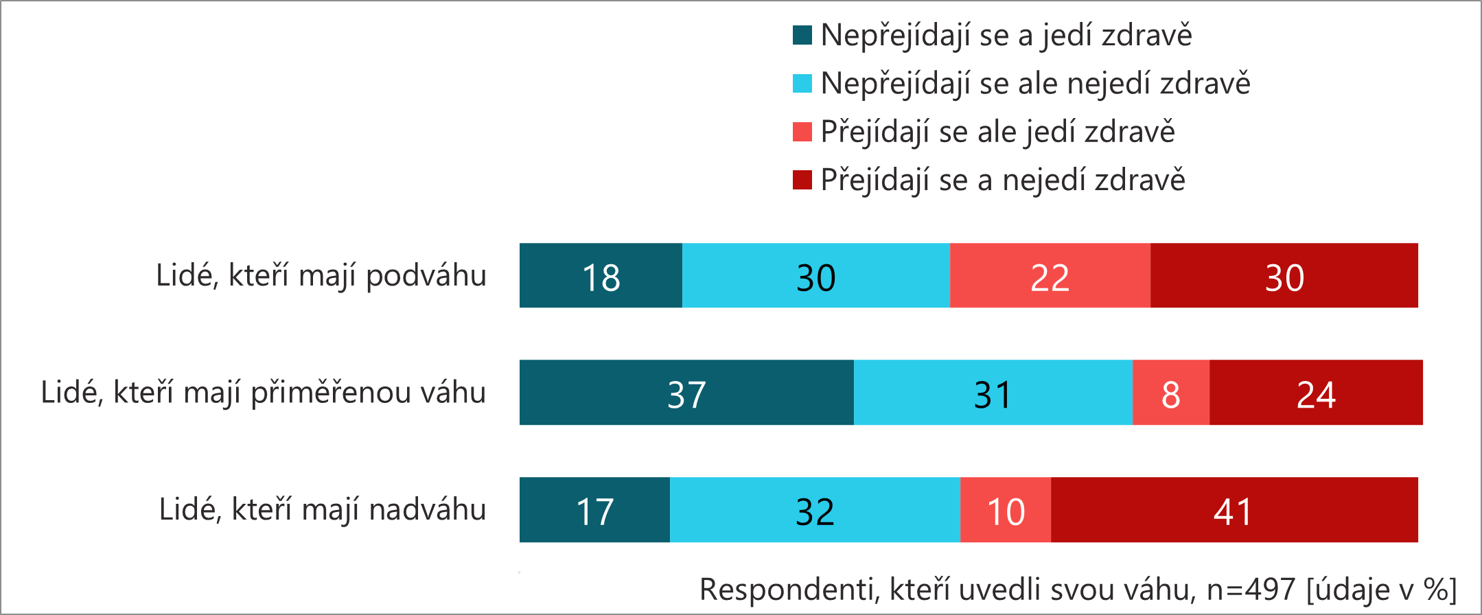 U lidí s přiměřenou váhou je výrazně častější kombinace rozumného množství a zdravé stravy (37 %) než u lidí s podváhou či nadváhou. U lidí s nadváhou je výrazně častější kombinace přejídání a nezdravé stravy (41 %) než u ostatních.