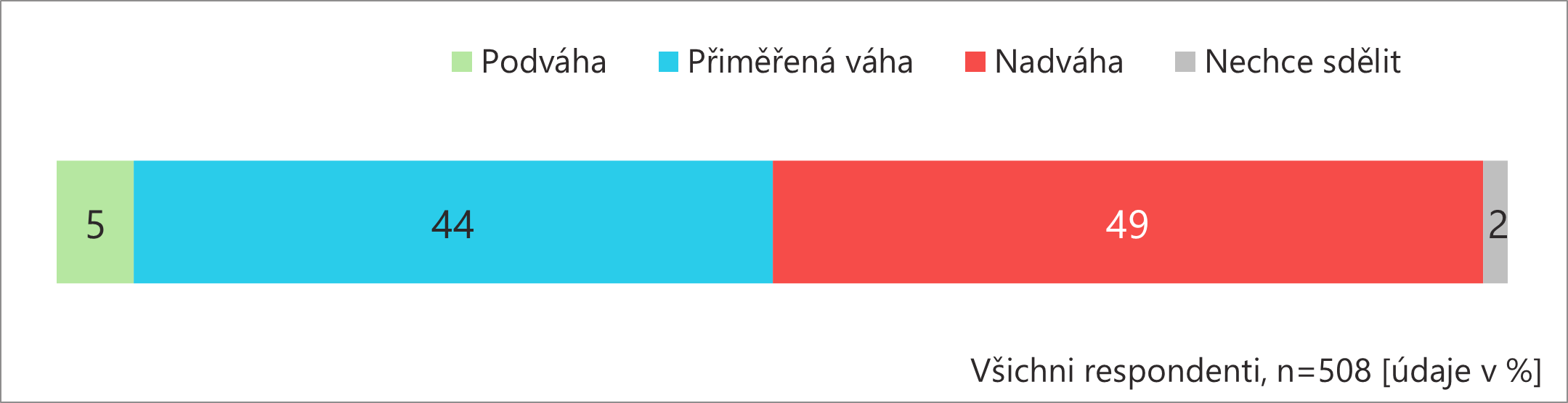 V dospělé české populaci má téměř polovina lidí nadváhu. Přiměřenou váhu má 44 % lidí a podváhu uvádějí jednotky procent osob (zařazení je deklaratorní a nebylo upravováno podle BMI). Častěji trpí nadváhou lidé ve věku 45-59 let (57 %) a podváhu častěji uvádějí mladí do 29 let (19 %).