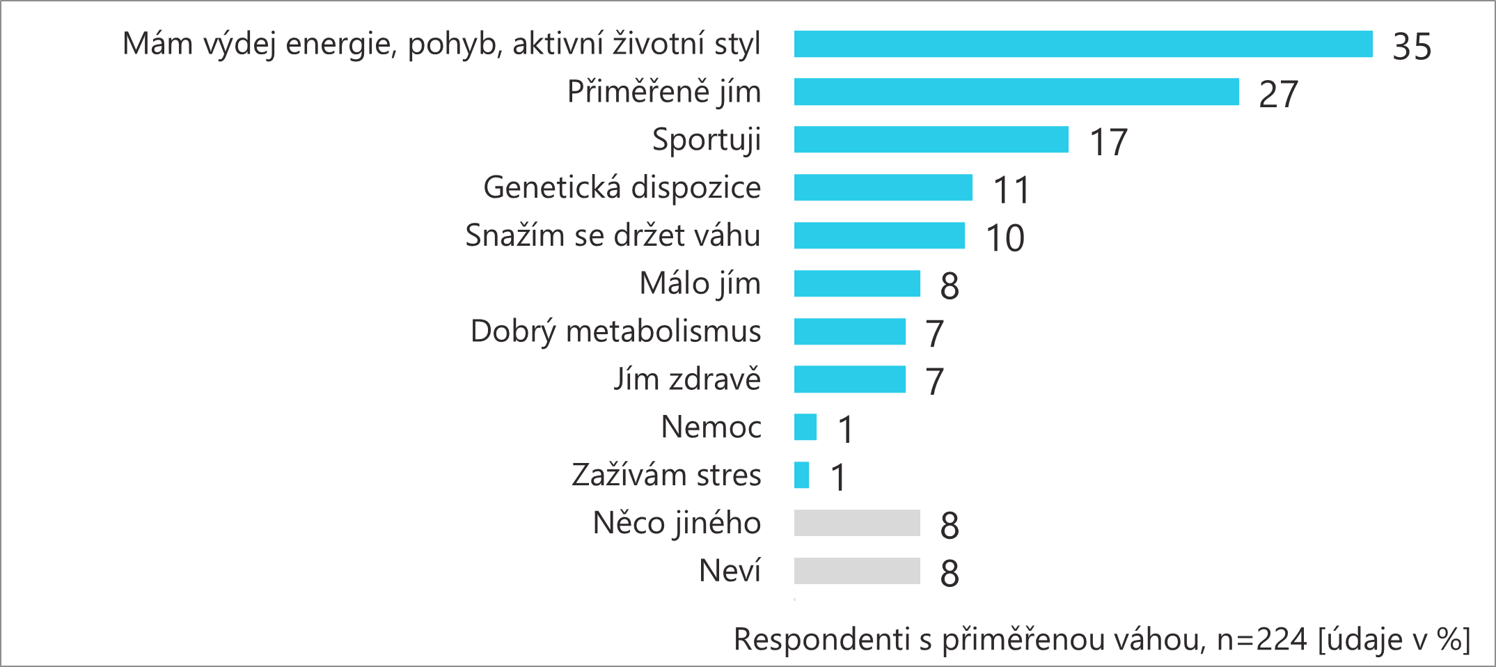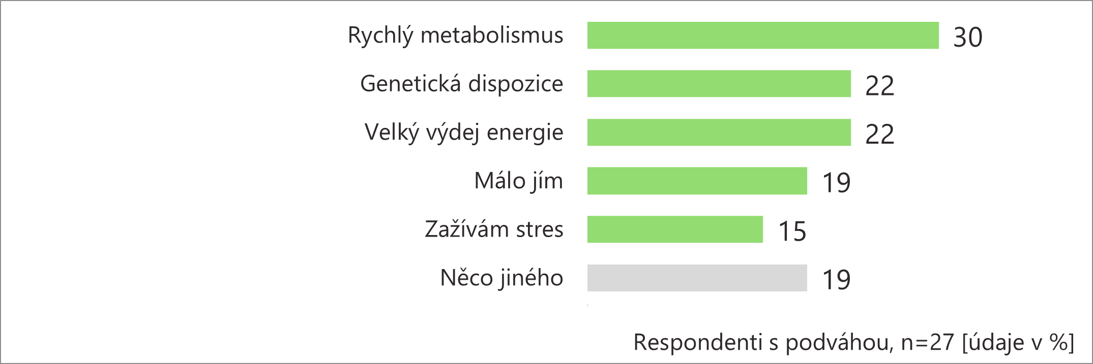 Zajímalo nás, co sami respondenti považují za hlavní důvod, proč váží tolik, kolik váží. Lidé s podváhou připisují nízkou hmotnost rychlému metabolismu, genetické predispozici a velkému výdeji energie. Lidé s přiměřenou váhou dávají svou váhu do souvislosti s aktivním stylem života a přiměřeným množstvím jídla. Lidé s nadváhou vidí příčinu v nedostatku pohybu, nezdravém stravování, nemoci nebo užívaní léků.