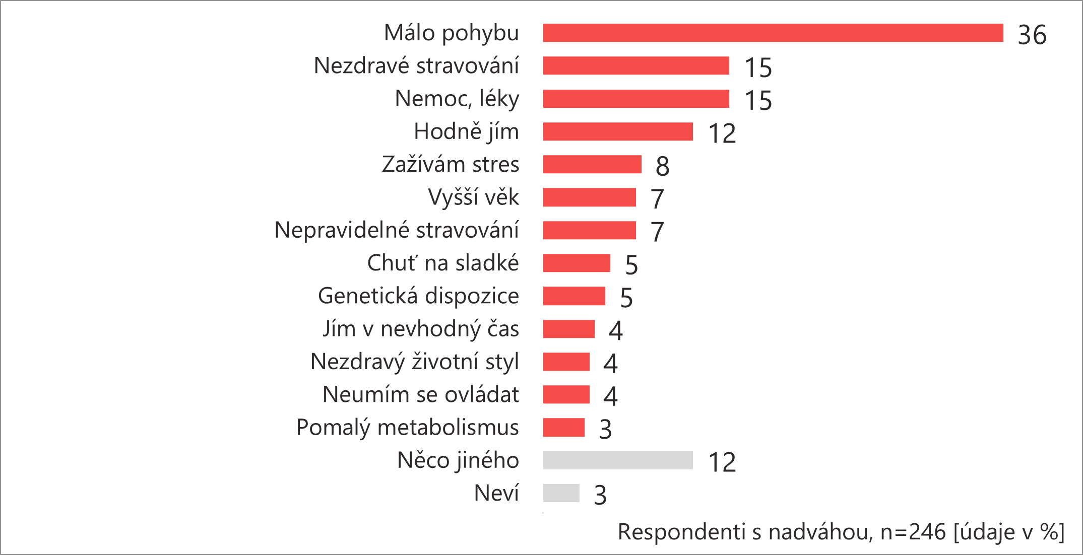 Výzkumná agentura STEM/MARK zjistila, že v dospělé české populaci lehce převažují lidé s nadváhou. Tito lidé jako příčinu své nadváhy sami udávají nedostatek pohybu. Z otázek na stravovací a životní návyky ale plyne, že se svým chováním liší od lidí s přiměřenou váhou a jejich problém souvisí hlavně se stravovacími návyky. Představa, že si tito lidé užívají nadměrné množství jídla je ale nespravedlivá. Významná část z nich se nepřejídá, ani z jídla nemá potěšení.