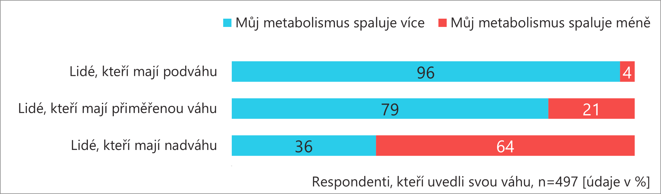 Nezabýváme se tím, zda rychlý a pomalý metabolismus existují, ale názorem na jeho projevy. Většina lidí s podváhou a přiměřenou váhou si myslí, že má rychlé spalování, zatímco lidé s nadváhou považují svůj metabolismus za pomalý.