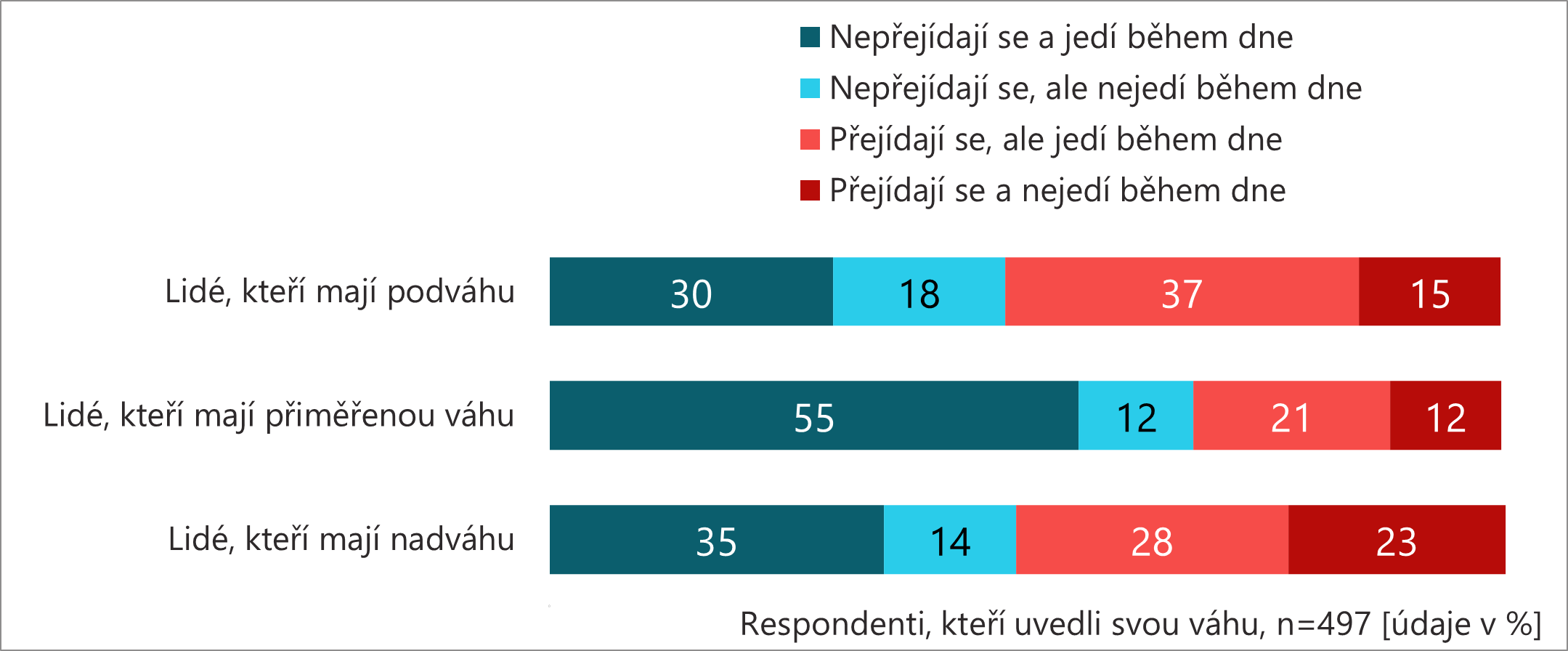 Čas na jídlo si během dne najde většina lidí s přiměřenou váhou (76 %), podváhou (67 %) i nadváhou (63 %). Mezi lidmi s přiměřenou váhou je výrazně častější kombinace jíst během dne a jíst rozumné množství – nepřejídat se (55 %). Mezi lidmi s nadváhou se častěji vyskytují lidé, kteří si čas na jídlo nenajdou (37 %) – v rámci nich se významně častěji objevují lidé, kteří se navíc přejídají (23 %), o nichž usuzujeme, že se přejídají na sklonku dne.