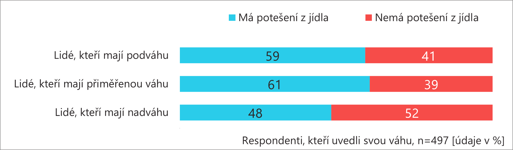 Potěšení z jídla mají překvapivě častěji lidé s přiměřenou váhou (61 %) a podváhou (59 %) než lidé s nadváhou. Lidé s nadváhou ve větší míře nemají jídlo jako potěšení. Vztah k vaření s váhou nesouvisí a vaření baví přibližně polovinu lidí bez ohledu na jejich váhu.