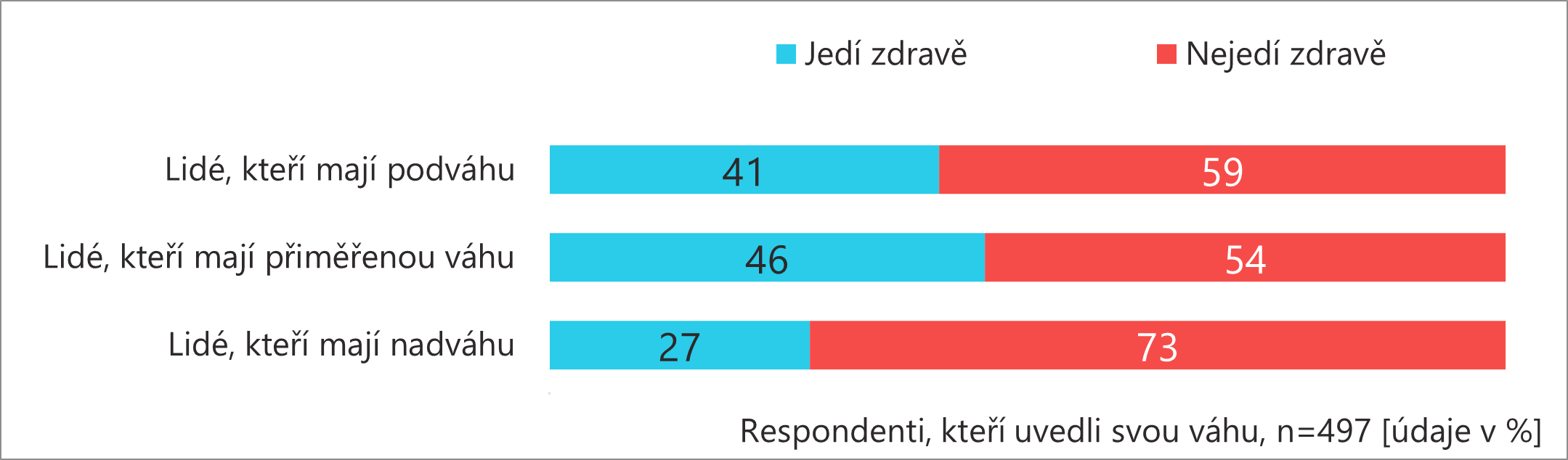 Zdravě se stravují častěji lidé s podváhou a přiměřenou váhou, ale ani u nich se nejedná o většinový jev. U lidí s nadváhou výrazně převažuje nezdravé stravování. Zdravá strava sama o sobě není zárukou nižší váhy, ale nezdravá strava častěji vede k nadváze. U lidí s nadváhou je navíc častá kombinace nezdravého stravování a přejídání se (40 %) a kombinace nezdravého stravování a hladovění během dne (30 %).